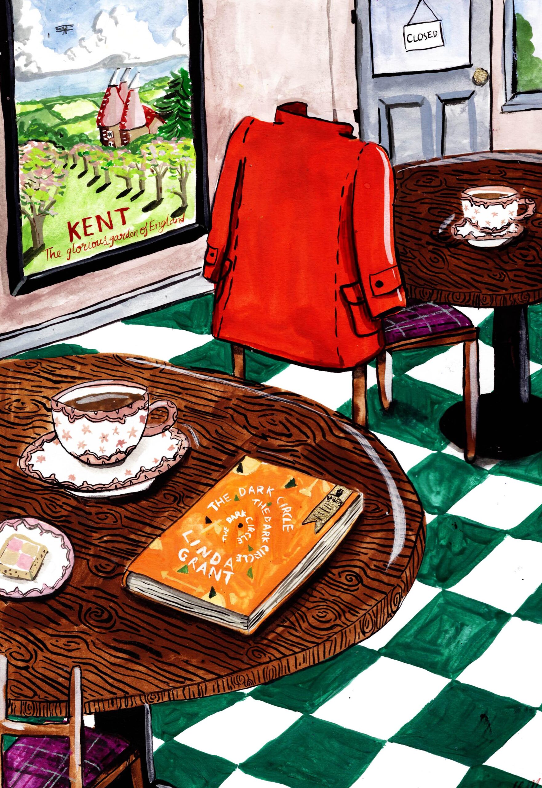 On this The Dark Circle-themed drawing, Ella said: ‘I wanted to give the illustration a slight vintage feel and the chairs I illustrated in this image are based around a set my Grandma had in her front room, When ever I think of the 1940’s I think of my Grandma so that was really helpful as a reference to colours that felt like I could include in this piece.’
