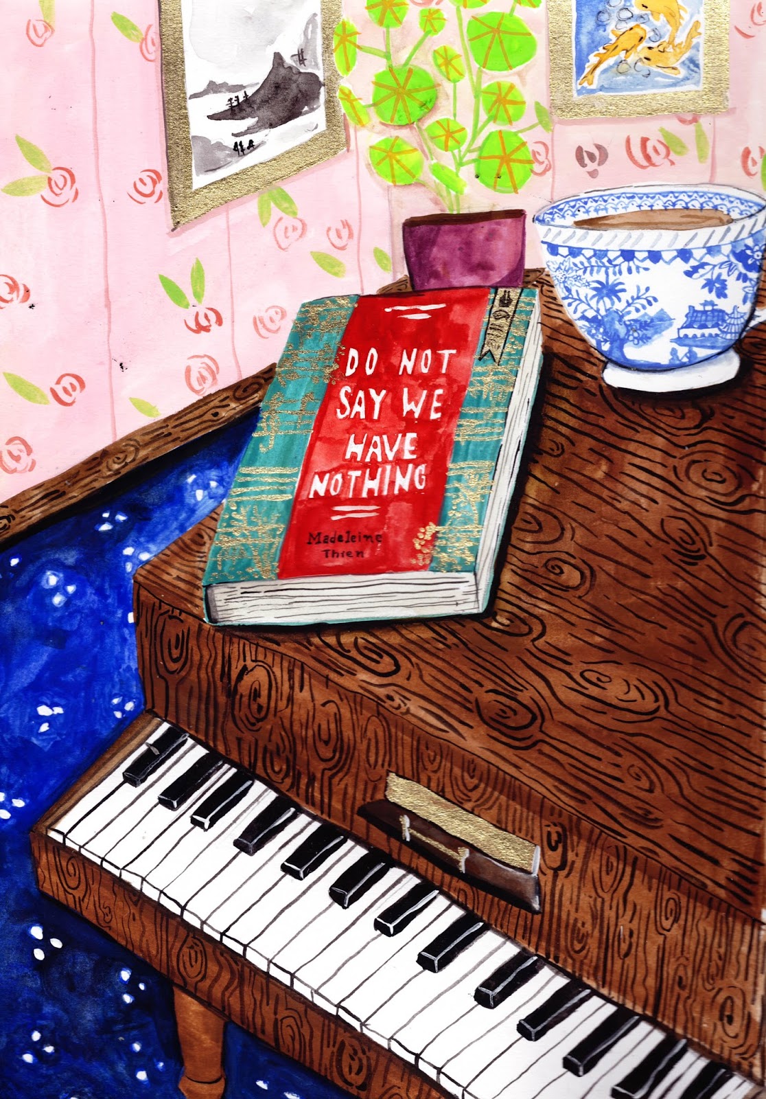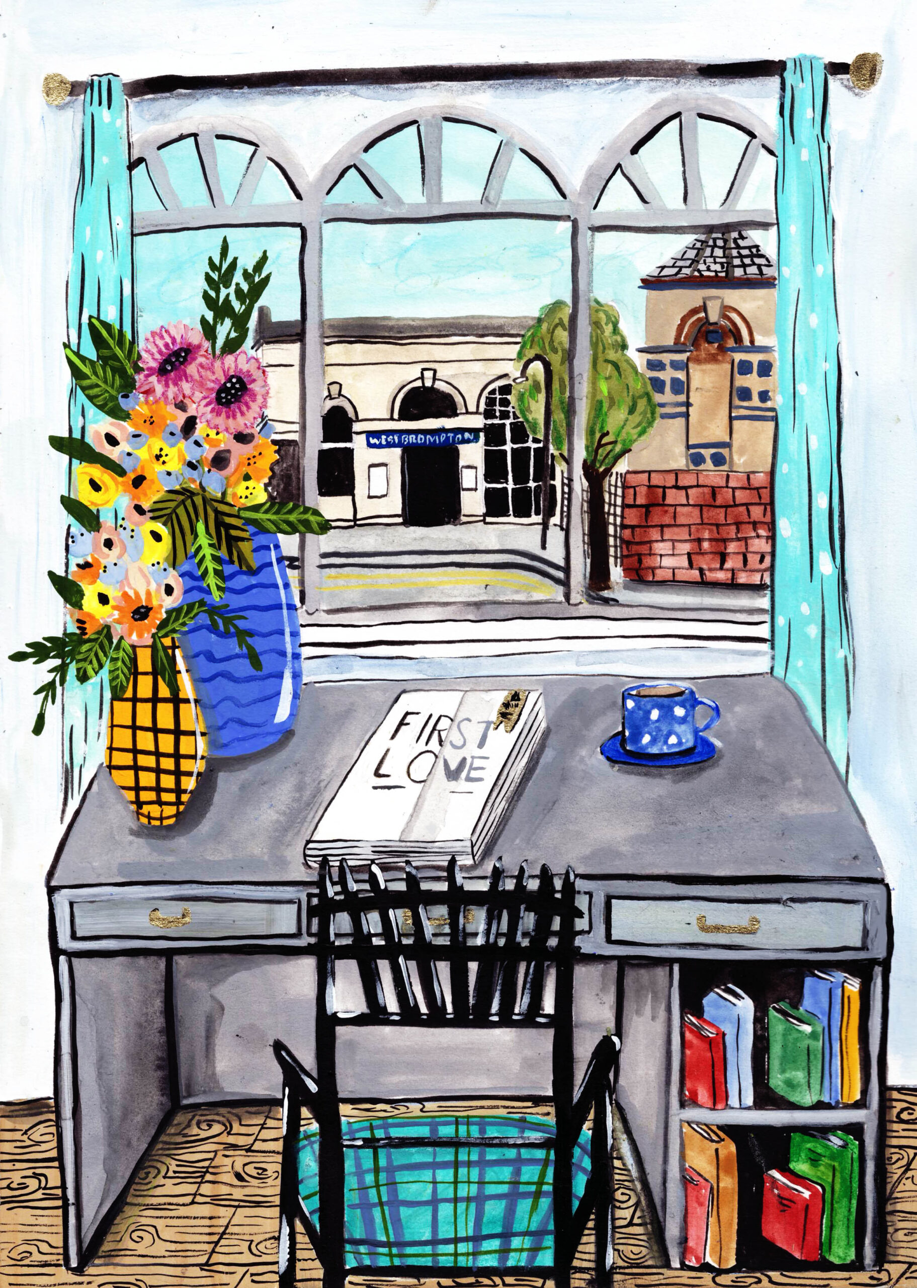 Ella said of her First Love-inspired illustration: ‘wanted to bring elements of the books in the illustrations so I felt like the interior set in the book First Love would be more homely and lived in, over looking West Brompton station is my favourite part of the illustration, the book it’s is a riveting read and at times had me rather curious as to the direction it was going to lead. Don’t be fooled by its simple exterior it is well written and I can see why it has been shortlisted for the Prize.’